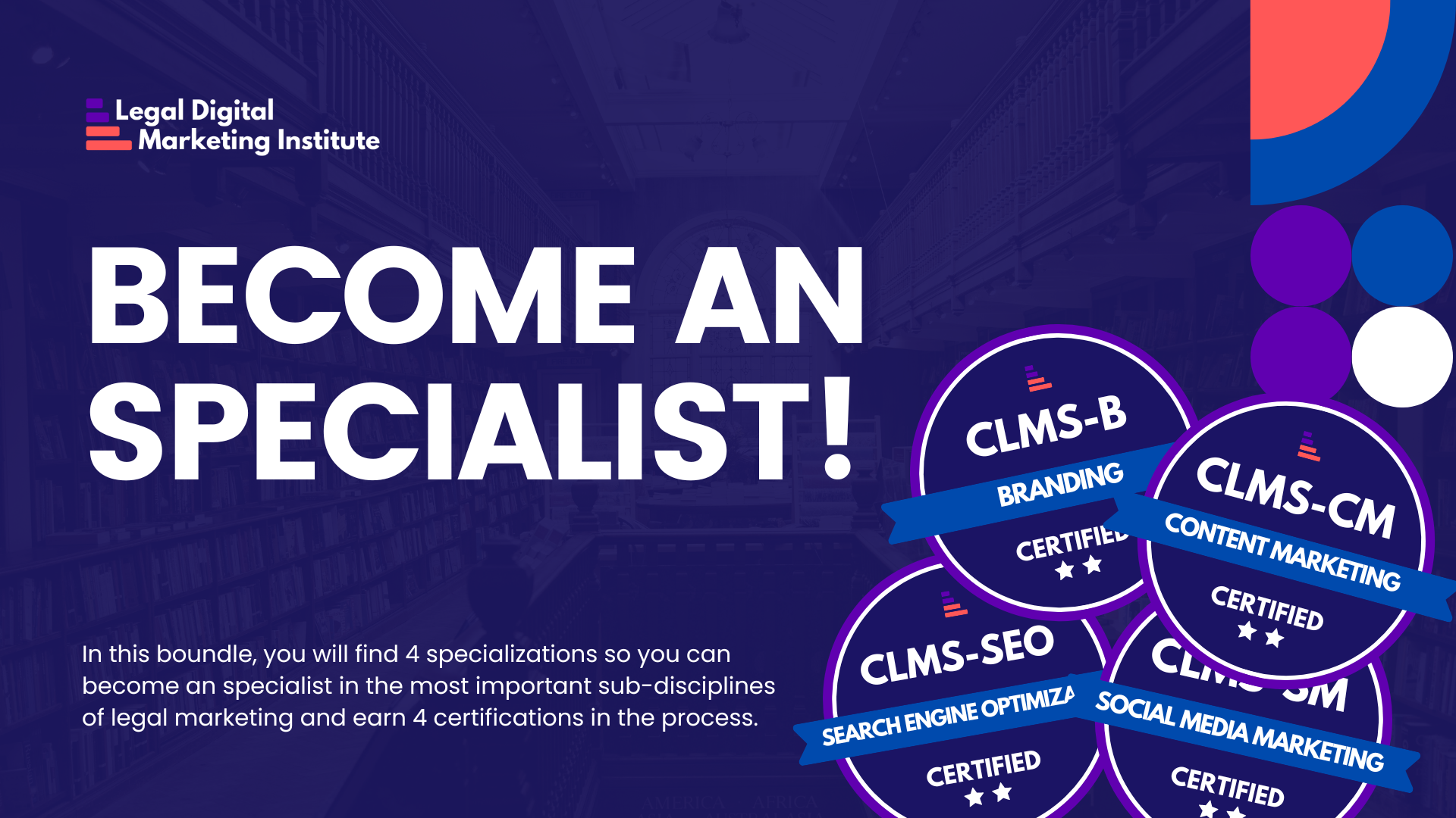 By purchasing any of the specialization courses you'll get a free PDF copy of the book Become a Legal Digital Marketer (Second Edition), access to our private LinkedIn and Facebook group for certified professionals, and a 30% discount on the CLDM and CLMA exam vouchers.