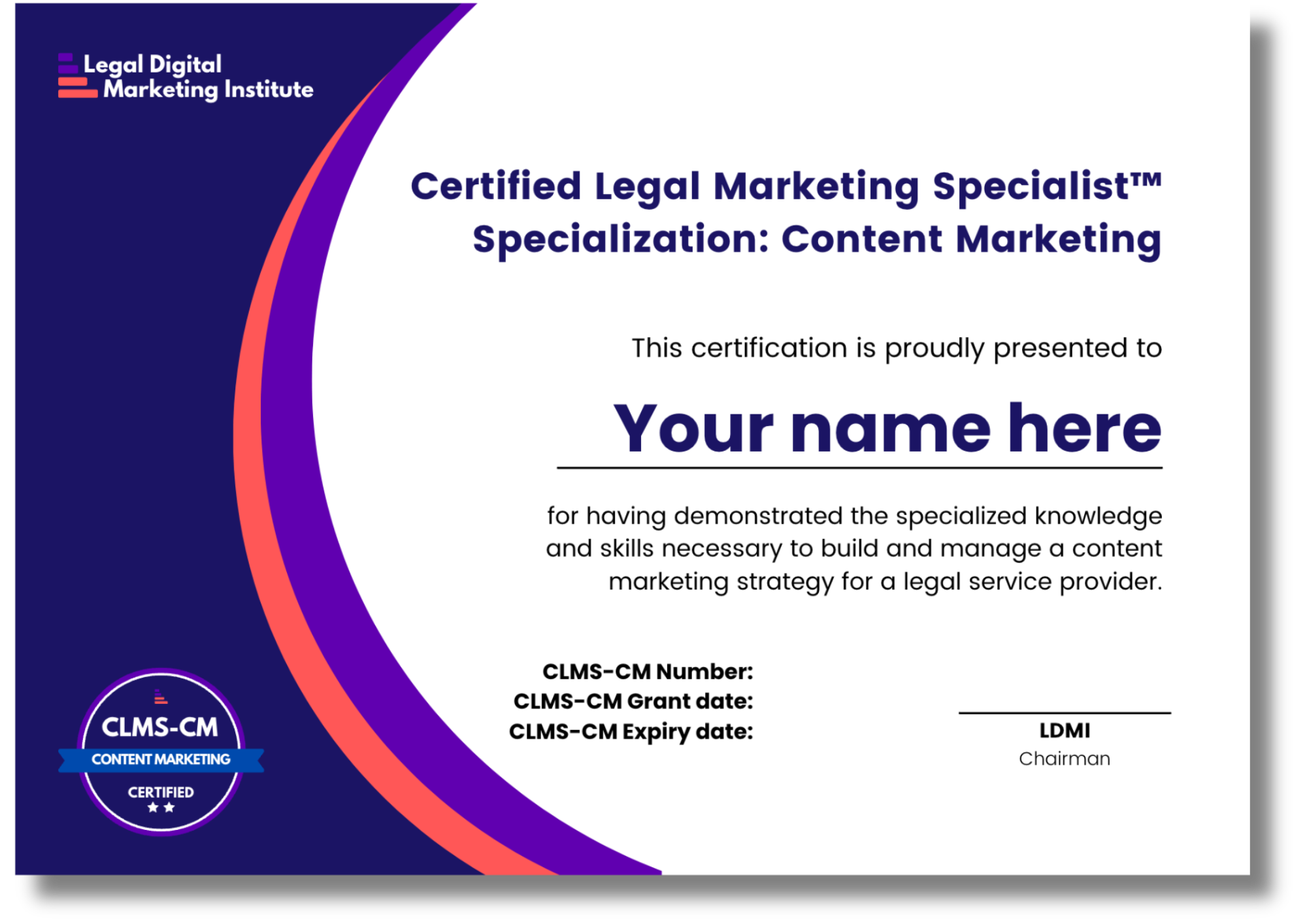 The Certified Legal Marketing Specialist™ - Content Marketing (CLMS-CM) certification was created with the goal of providing lawyers, law students, marketing students, and legal marketing consultants in charge of promoting legal services, with an entry-level certification that can validate the knowledge obtained in the field of content marketing for legal services.