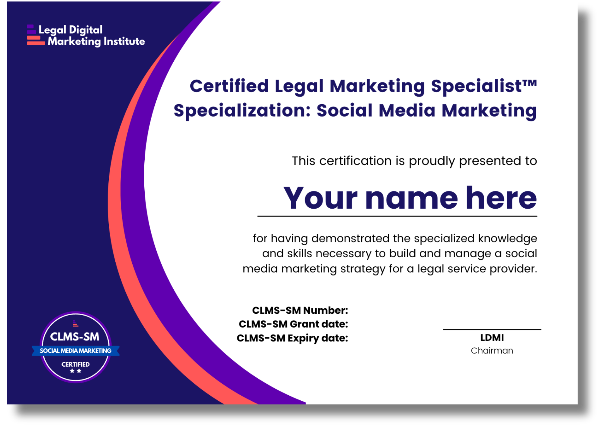 Earn the Certified Legal Marketing Specialist - Social Media Marketing™ (CLMS-SM) credential, a specialist-level certification that validates your knowledge of social media marketing applied to legal services.